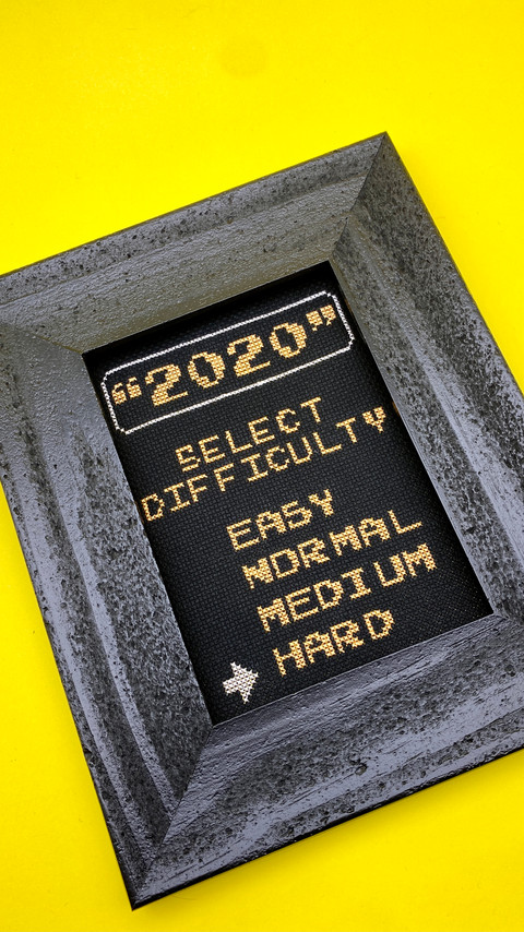 So I went back to the drawing board and decided even though I wanted to go go go, I realized I needed to start somewhere more simple. That's where 8-bit video game ideas came into my head. Those types of things are already in a blocky format, perfect for cross stitching. Combine that with a way I wanted to remember this insane pandemic year and the "2020 Choose Your Difficulty" pattern was born! It fits in a 5x7 frame (honestly anything bigger than 8x10 and I risk not ever finishing the project).